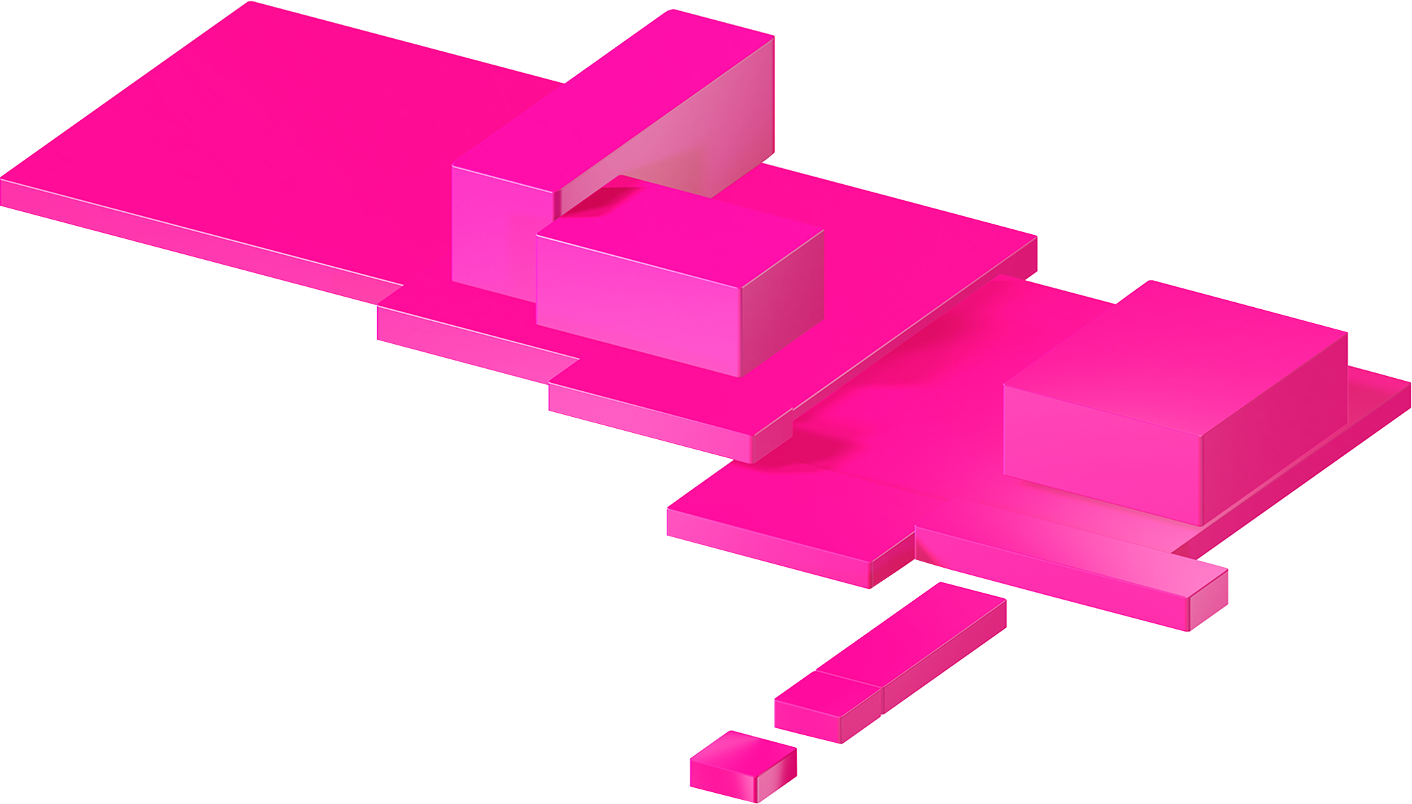 Изометрическое изображение платформы со стопкой слоев в бело-розовых тонах, над которой парит объемная надпись "ДА" в розовом цвете на светлом минималистичном фоне